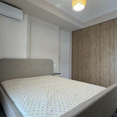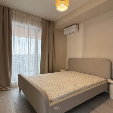 Dormitorul continuă aceeași direcție estetică, oferind un ambient intim și relaxant, iar băile, tratate cu finisaje cu aspect marmorat, introduc o notă subtilă de rafinament.