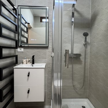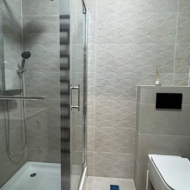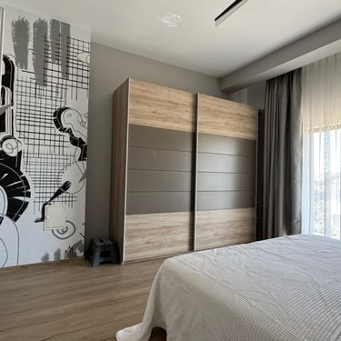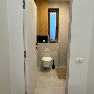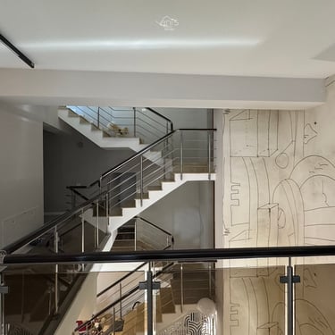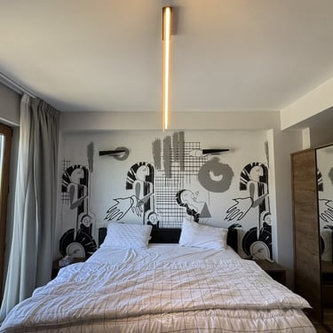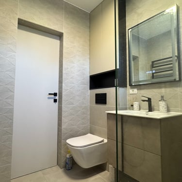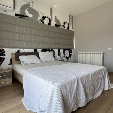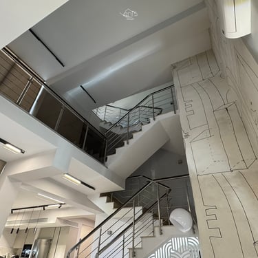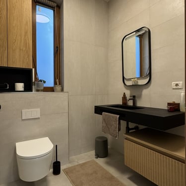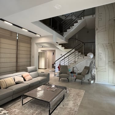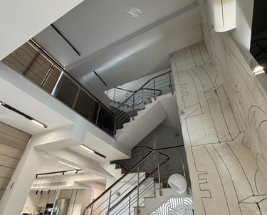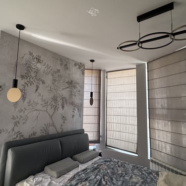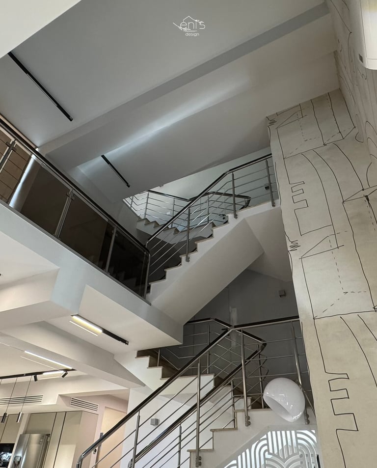 În living, tapetul aplicat pe întreaga înălțime de aproximativ 6 metri creează un efect de alungire și verticalitate, amplificând percepția volumului și conferind spațiului un caracter scenografic. Circulația verticală devine, la rândul ei, un element definitoriu datorită scării metalice cu balustradă din sticlă, completată de peretele accent ce funcționează ca pivot vizual și conectează coerent cele trei niveluri ale locuinței. Dormitoarele sunt concepute ca spații de refugiu, definite prin texturi moi și elemente grafice personalizate, care conferă identitate fiecărei camere. Băile continuă limbajul modern al locuinței, folosind materiale naturale, linii curate și iluminare accentuată pentru a oferi o experiență contemporană completă. Acest proiect reflectă o abordare matură a designului interior, în care simplitatea controlată, atenția la detalii și confortul cotidian se îmbină armonios într-o locuință coerentă, modernă și echilibrată.