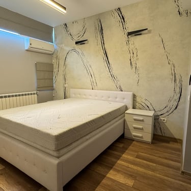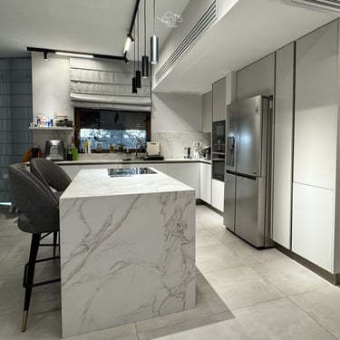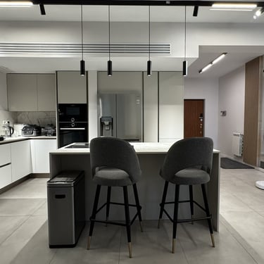 Spațiile sunt luminoase, bine proporționate și unificate vizual printr-o paletă cromatică neutră, cu tonuri de bej, gri cald și accente texturate. Zona de zi integrează livingul, diningul și bucătăria într-un concept open-space fluid, unde mobilierul minimalist, suprafețele din piatră și detaliile metalice creează un echilibru subtil între eleganță și funcționalitate.