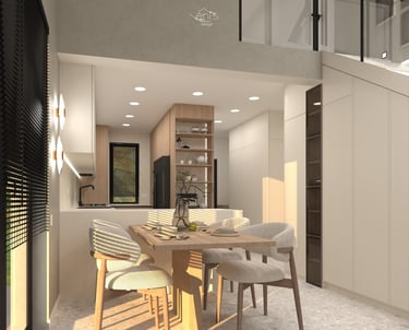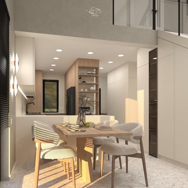 Livingul, diningul și bucătăria sunt configurate ca un ansamblu unitar, cu mobilier custom-made și soluții de depozitare integrate, optimizate pentru eficiență și ergonomie. Zona de noapte și spațiile auxiliare urmăresc aceeași abordare formală, cu linii curate, volumetrii controlate și detalii executate cu precizie.