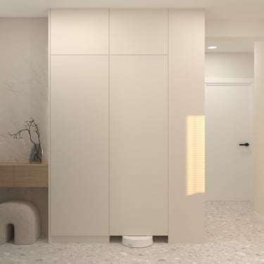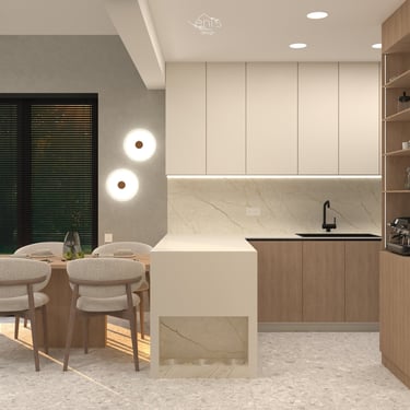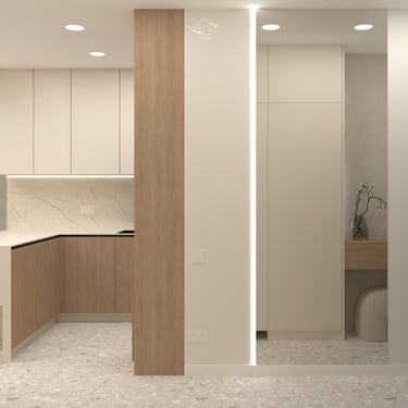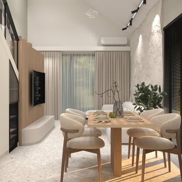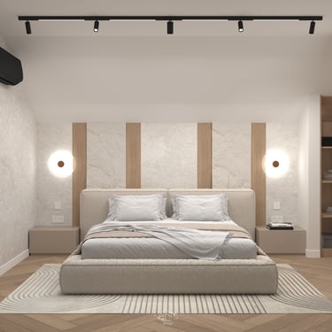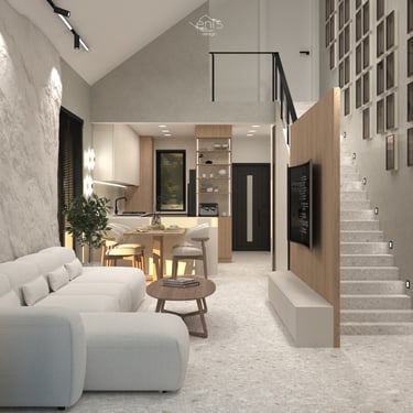 Paleta cromatică neutră, finisajele premium și integrarea elementelor din lemn natural asigură o atmosferă calmă și echilibrată. Iluminatul arhitectural este stratificat și calibrat pentru a evidenția texturile și geometria volumelor, contribuind la definirea clară a zonelor funcționale.