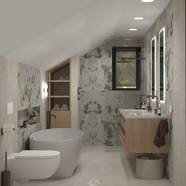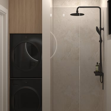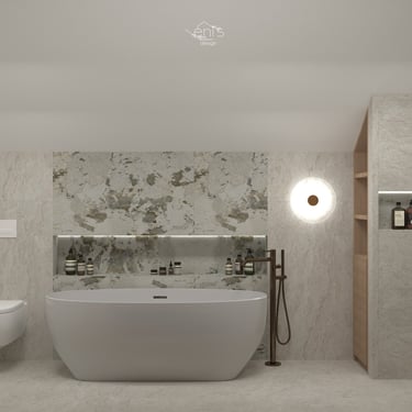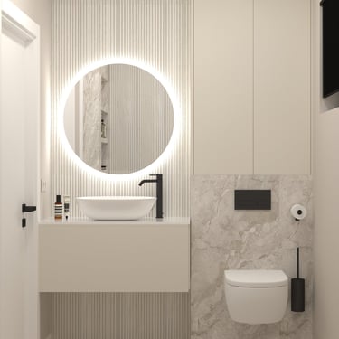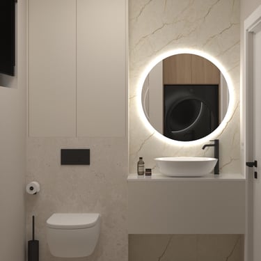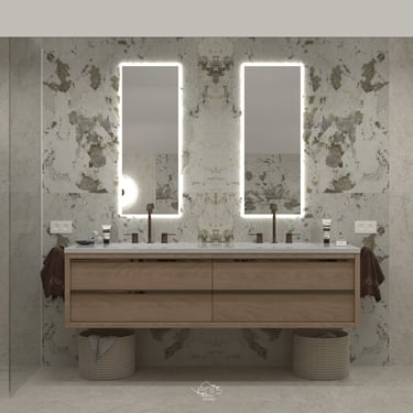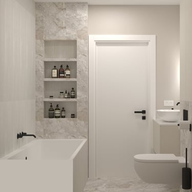 Băile sunt tratate într-un registru minimalist, utilizând suprafețe continue, elemente integrate și iluminare indirectă pentru a susține un caracter ordonat și premium.