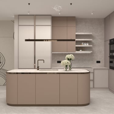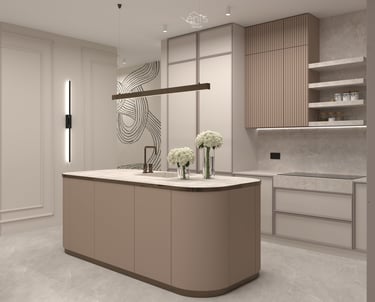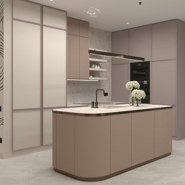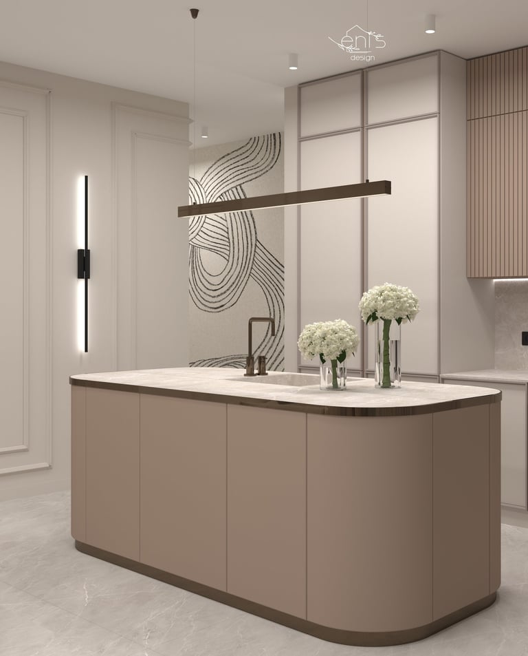 Bucătăria, configurată în jurul unei insule sculpturale cu forme rotunjite, îmbină armonios elemente mate, suprafețe minerale și soluții de depozitare integrate. Jocul de curbe, contrastele subtile și iluminarea ambientală accentuează caracterul modern și fluid al spațiului.