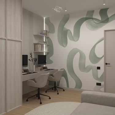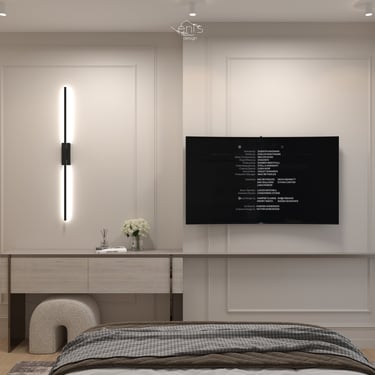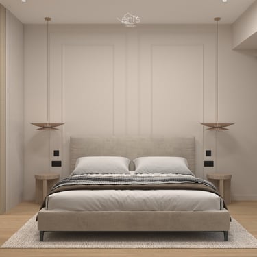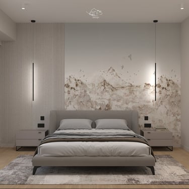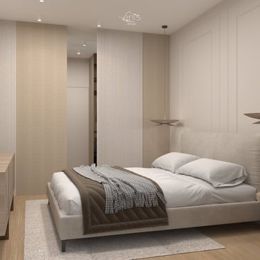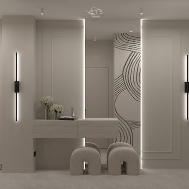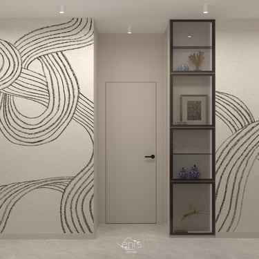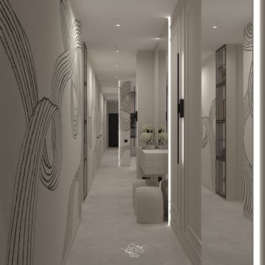 Holul de intrare introduce tema grafică a proiectului prin panouri decorative și linii fluide, creând un impact vizual încă de la primul pas. Zona de noapte se remarcă prin dormitorul minimalist și sofisticat, unde volumetriile discrete, textilele premium și iluminatul atent calibrat construiesc un spațiu dedicat confortului absolut.