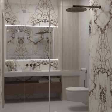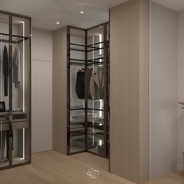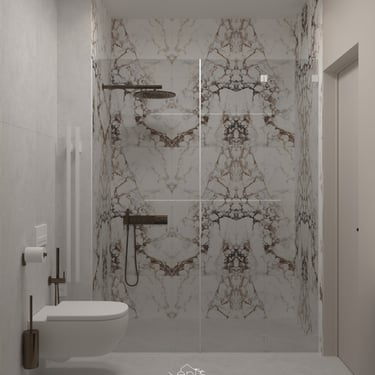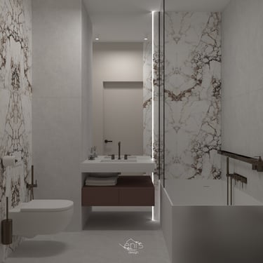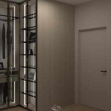 Dressingul walk-in devine o piesă centrală a proiectului, realizat cu structuri elegante metalice, vitrine transparente și compartimentări funcționale, oferind un mix perfect între estetic și practic. Băile continuă limbajul premium prin utilizarea pietrei cu texturi puternice, profile metalice fine și detalii personalizate care ridică întregul ansamblu la un nivel superior.