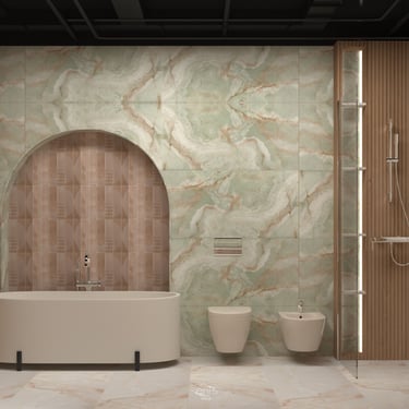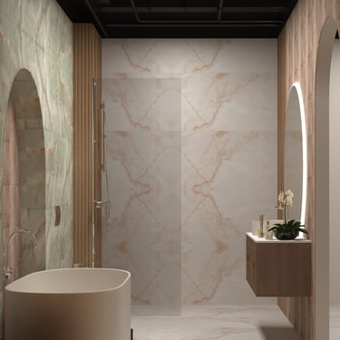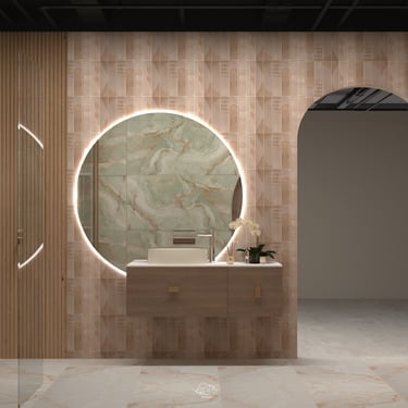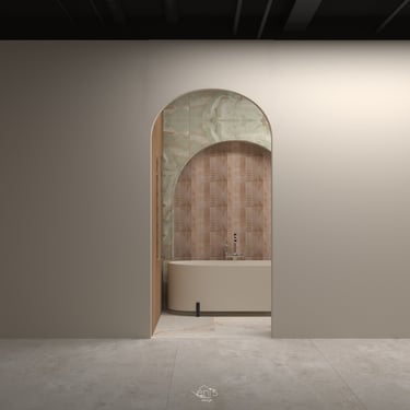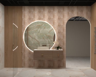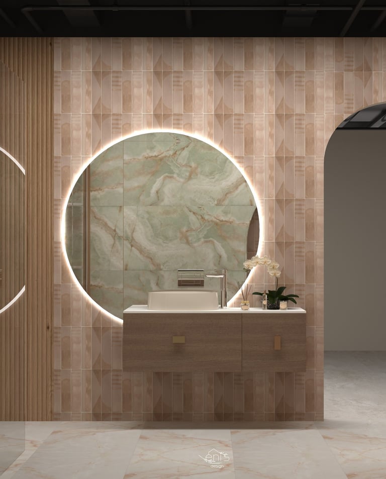 Acest concept de amenajare pentru zona expozițională din Romstal Concept Store propune o atmosferă calmă, sofisticată și inspirată din universul spa-urilor contemporane. Paleta este construită pe nuanțe pastelate roz și verde din colecția Evolution Ceramics, completate de lemnul riflat care adaugă textură, căldură și un ritm vizual elegant.