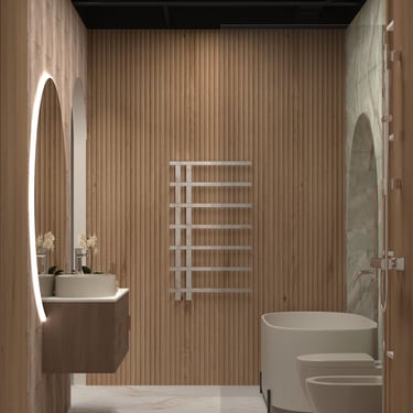 Elementele sanitare în finisaj crom — baterii, accesorii, wc și bideu — creează contraste fine și un aer premium, în timp ce lavoarul bej și cada freestanding introduc o notă de rafinament sculptural. Zona de duș, integrată minimalist, păstrează aceeași direcție curată și relaxantă.