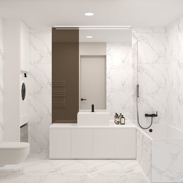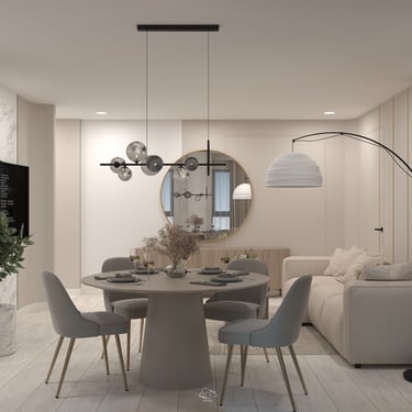 Livingul luminos se deschide fluent către dining și bucătărie, unde liniile curate, mobilierul minimalist și finisajele mate generează o atmosferă calmă și elegantă. Dormitorul păstrează aceeași direcție, folosind texturi calde și accente naturale, în timp ce băile cu finisaj marmorat adaugă o notă premium.